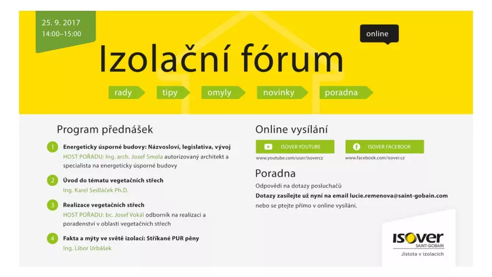 Téma vegetační střechy bude na programu dalšího Izolačního fóra online, které se koná 25. září ve 14 hodin a sledovat jej můžete na na Facebooku nebo Youtube. Kromě informací o realizacích vegetačních střech se dozvíte i novinky ze světa izolací.
