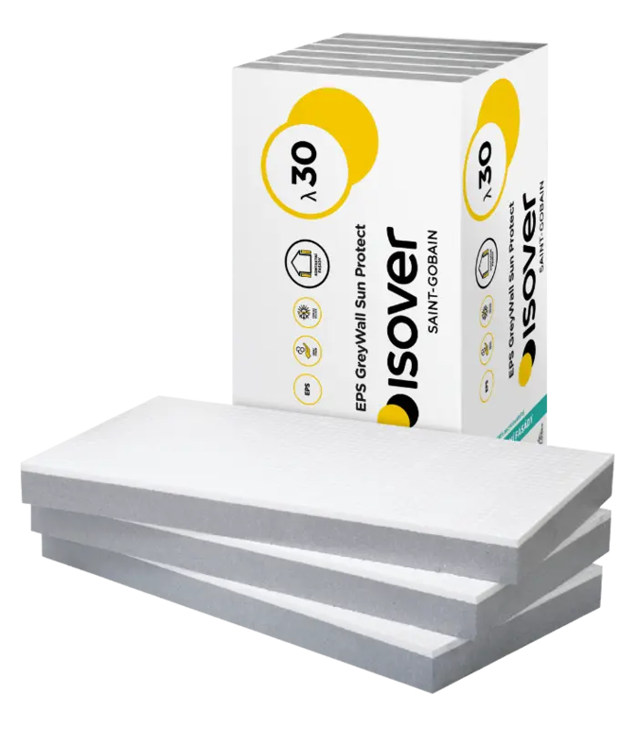 Izolační desky Isover EPS GreyWall Sun Protect jsou nejnovějším typem EPS desek vyráběných do forem. Miliony buněk izolantu se stopovou přísadou grafitu účinně odrážejí teplo zpět k jeho zdroji a podstatně tak zlepšují izolační vlastnosti. Desky jsou opatřeny lícovou bílou vrstvou (bílý povrch aplikovat vždy směrem od zateplované stěny) a tím jsou ochráněny proti působení přímého slunce při montáži. Desky je tak možno montovat na bytové domy i ze závěsných lávek. Izolační desky Isover EPS GreyWall Sun Protect jsou vyrobeny pomocí nejnovějších technologií bez obsahu CFC a HCFC (známé jako freony). Moderní technologie zajišťuje stálou kvalitu a minimální energetickou náročnost výroby, což deskám zajišťuje výborný poměr cena/výkon. Veškeré desky EPS Isover se vyrábějí v samozhášivém provedení se zvýšenou požární bezpečností.